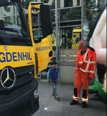 Fotobijschrift: Marco, gekleed in zijn verplichte oranje pak, was met zijn bergingswagen op een kinderfeest in Den Hoorn. De kinderen mochten in de vrachtwagen zitten en vragen stellen. Dat zijn de krenten uit de pap.